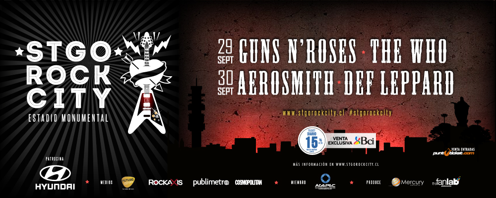 Ya comenzó la venta de entradas para Stgo Rock City, festival que reunirá a Guns N’ Roses, The Who, Aerosmith y Def Leppard el viernes 29 y el sábado 30 de septiembre en el Estadio Monumental.