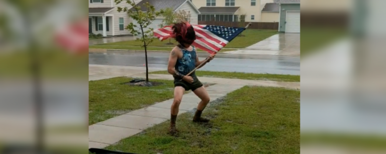Finalmente, apareció otro «loco» rockeando con el clásico «Rock You Like A Hurricane» de Scorpions durante el huracán Florence mientras sostiene la bandera de los Estados Unidos.