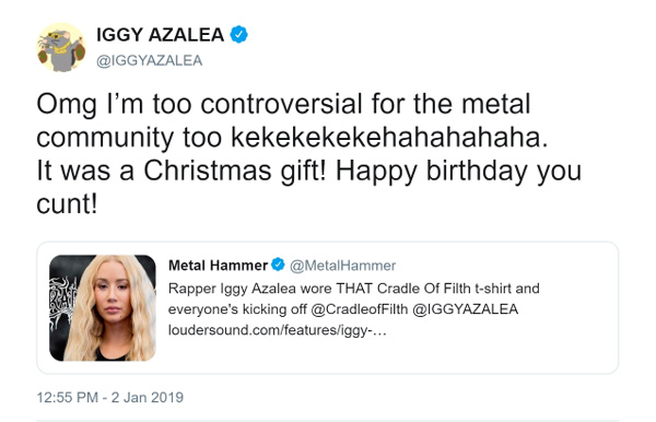 El pie de imagen de la publicación estaba compuesto por el emoticon de una peineta y el número 2018, haciendo referencia al pasado año. La ira y las críticas de varios fans no se hicieron esperar. Ante esto, la rapera respondió con un tweet que luego borró en el que decía lo siguiente, haciendo referencia al texto del dorso de la camiseta: “Oh dios mío, mi camiseta ha generado demasiada controversia en la comunidad del metal también (risas). ¡Era un regalo de Navidad! ¡Feliz cumpleaños, hijo de puta!”.
