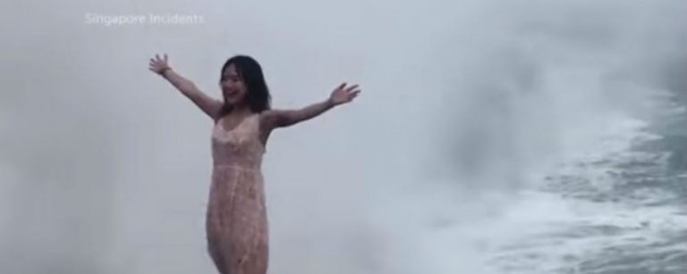 Como se puede ver en el video, la mujer se paró en el acantilado para conseguir una foto con una gran ola a sus espaldas.