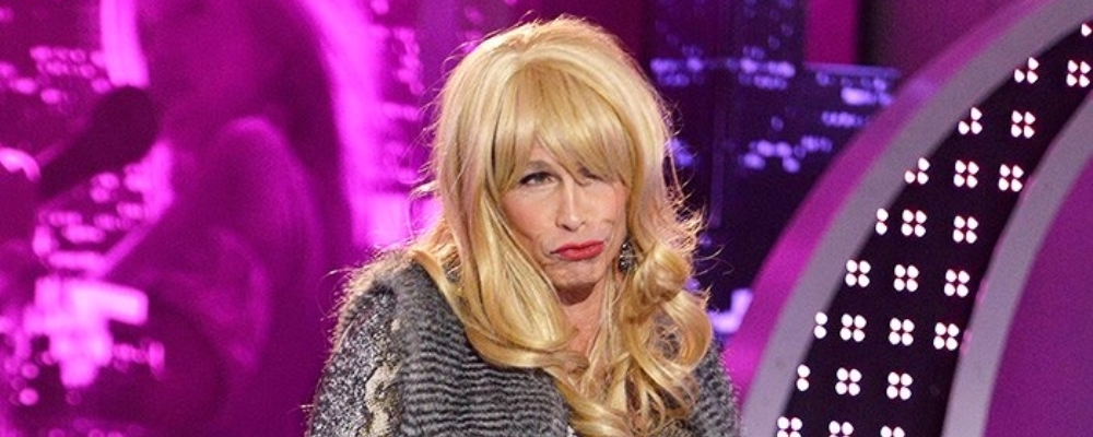 El cantante apareció vestido con una minifalda estilo animal print, un sweater sin mangas gris y una peluca rubia.