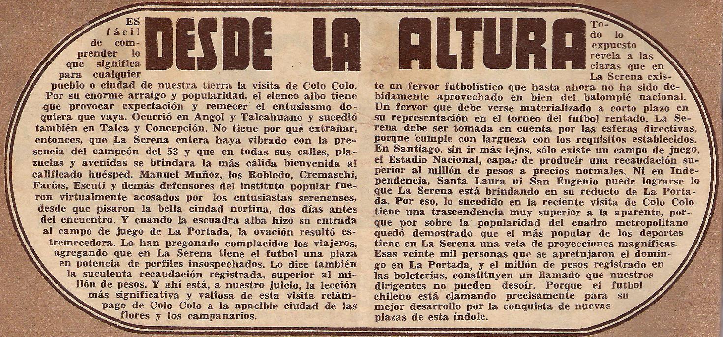 A mediados de 1954, ante 20 mil almas que repletaron el recién estrenado estadio La Portada, Colo Colo empató a uno contra la selección de La Serena (campeón nacional de fútbol amateur en 1949, 1951 y 1953). “Lo han pregonado los complacidos viajeros: La Serena es una plaza de perfiles insospechados… existe un fervor futbolístico que hasta ahora no ha sido debidamente aprovechado en bien del balompié nacional”, editorializó Julio Martínez en la revista Estadio, invitando a la dirigencia a evaluar la ampliación del balompié rentado más allá de la zona central.