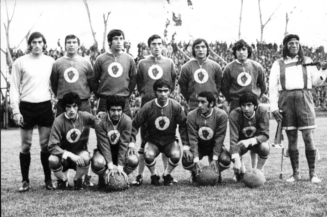 Rescatada de un set de diapositivas con que la revista Estadio ilustraba sus contraportadas a color, en la imagen de arriba se ve al plantel de 1972. Como se ve, los «diablos rojos» se habían tomado tan a pecho su apodo que decidieron estampar nada menos que un espantoso demonio en su camiseta. Más curiosa resulta aún la foto de abajo, con el plantel flanqueado por un extraño sujeto disfrazado. Equipado con corneta y matraca, esta especie de mapuche-tirolés aparece dentro de la cancha en muchas fotos de la época: era la mascota oficial.