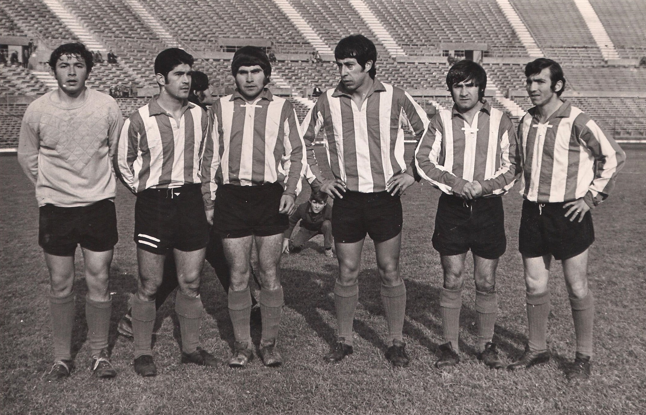 Abajo vemos a la zaga del cuadro linarense posando antes del match (y a un cabro chico catete que se asoma entre las piernas). Hay algo raro: en algún momento, Lister Rossel se cambió de camiseta.