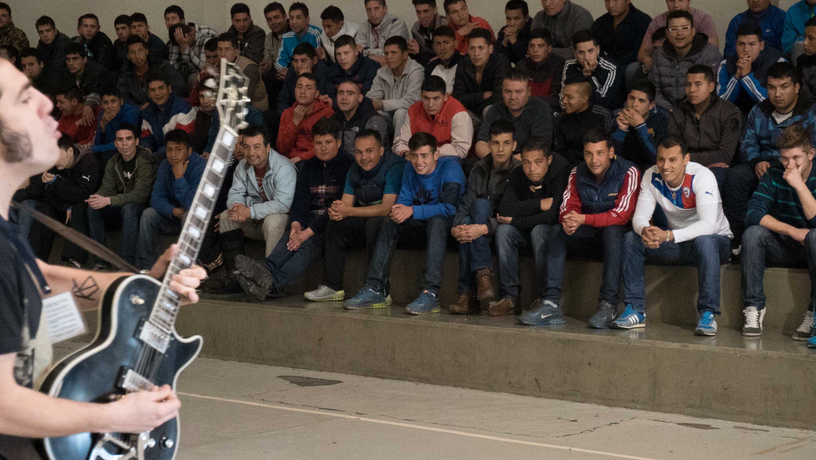 Como B.B King. Como Johnny Cash. No sé si fue pensado o mera coincidencia, pero Weichafe fechó su presentación en la cárcel concesionada Santiago Uno justo dos días antes de un nuevo aniversario de la muerte del hombre de negro. La verdad, con nuestro fotógrafo Juan Pablo Quiroz no sabíamos muy bien qué esperar. Ni siquiera estábamos al tanto del tipo de internos que estarían en el show.