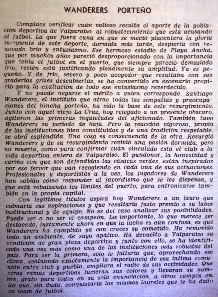 Durante medio siglo, mientras el deporte chileno se armaba de a poquito, el equipo caturro se consolidó como el mejor, el más popular y genuino representante del fútbol porteño. Desde entonces, la ciudad y su club sostienen un romance que no se da en ninguna otra parte de Chile: Wanderers es sinónimo de Valparaíso.
