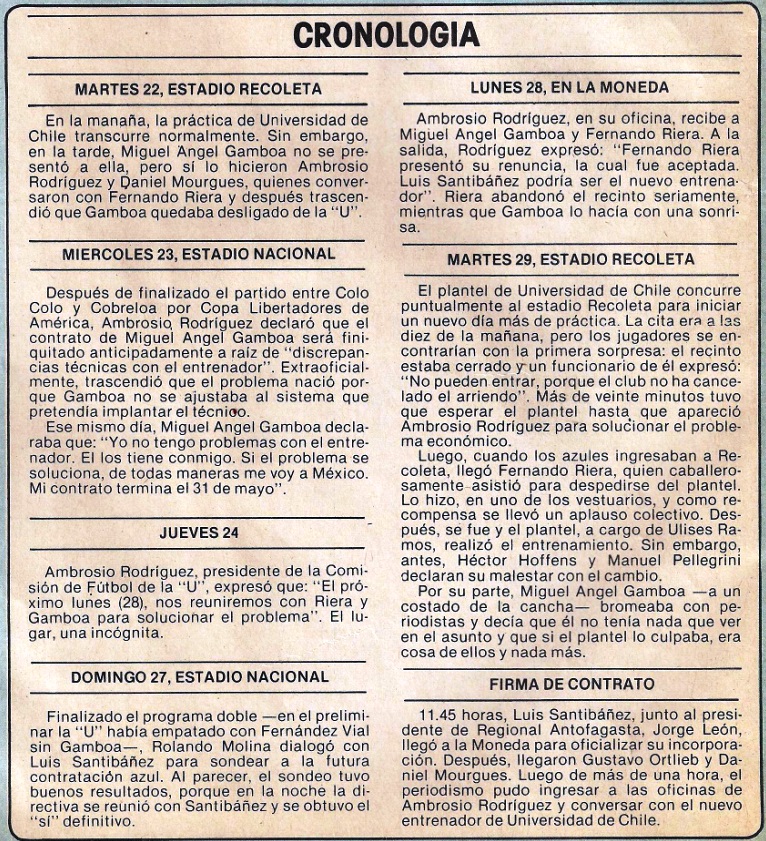 El lunes 28 de abril, en La Moneda, el presidente de la comisión de fútbol de la Corfuch y Procurador General de la República, Ambrosio Rodríguez, rehabilitó a Gamboa y despidió sin más a Fernando Riera. Al día siguiente, en las mismas oficinas donde se perseguía judicialmente a los enemigos de la dictadura, firmó el nuevo técnico azul: Luis Santibáñez, quien el año previo había sido cesado de la Selección y de la UC, y que ya tenía un acuerdo de palabra para irse a dirigir a Regional Antofagasta (que había sumado a 8 mil nuevos socios para solventar su inminente llegada).