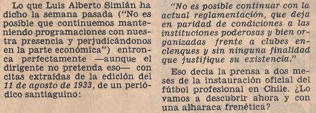 “Queremos jugar en reuniones simples. No es posible seguir manteniendo programaciones con nuestra presencia y perjudicándonos en la parte económica. Los árbitros, por parecer imparciales, nos están cargando la mano. No es posible que en un directorio donde se resuelven los problemas del fútbol profesional no esté representado Colo Colo. Somos más y aportamos más, por ejemplo, que Ovalle”, bramó el hijo del “Pulpo” Simián (legendario arquero de la U en los ‘40).