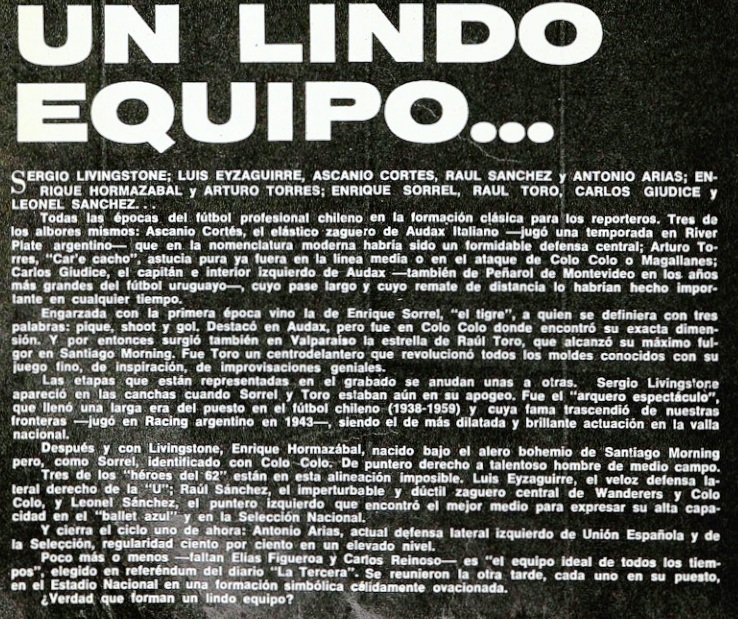 Dejemos hablar al viejo periodista, testigo privilegiado de las penurias de los torneos chilenos desde su nacimiento. “Concuerdo con casi todas las nominaciones restantes. Livingstone ha sido el mejor arquero que ha producido Chile; Lucho Eyzaguirre y Antonio Arias son dos marcadores de punta notables; Enrique Sorrel fue pique, chute y gol; Raúl Toro resume en el recuerdo la más alta expresión de condición natural, de habilidad pura, de fútbol en relación a la pelota. Leonel Sánchez tendrá que ser considerado como el zurdo más completo que ha pasado por nuestras canchas, tal como Enrique Hormazábal debe ser estimado en el pináculo de los creadores de juego, los peones de ataque, los que llevan las riendas de medio campo hacia adelante: pase, picardía, remate, claridad, todo. Este equipo ideal lo completaron el gran Ascanio Cortés, un zaguero de área para todas las épocas; Raúl Sánchez, técnico, fluido, elegante como ninguno; ‘Carecacho’ Torres -arquetipo del antiguo centro half, convertido en aduana y capataz del inmenso océano central- y don Carlos Giudice, cuyo pase de treinta metros y su disparo de igual distancia hubiesen calzado justo con las exigencias de hoy”.