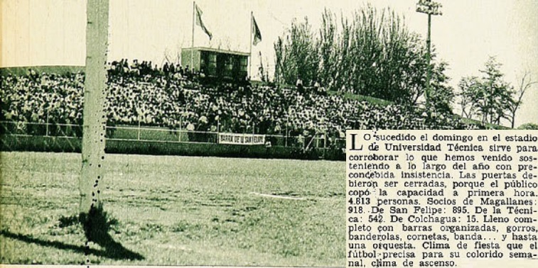Nunca antes -ni después- se viviría tanto fervor en los “potreros”. Calera contrató al supercrack René Meléndez, en el mayor batatazo anual del mercado de pases. En sus 11 partidos como local, La Serena, Coquimbo y San Felipe promediaron asistencias de 10 mil espectadores. Transandino sumó la friolera de dos mil socios con sus cuotas al día (!) y anunció la construcción de un nuevo estadio. Incluso la UTE, dejando de lado su tradicional modestia, se dio el lujo de inaugurar en junio su propia cancha. “Un aporte magnífico es el estadio de la Universidad Técnica del Estadio. Cómodo, pequeño, moderno, sumamente confortable, un chiche en plena comuna Quinta Normal”, describía Julio Martínez. En la foto de arriba vemos una postal irrepetible: ese recinto lleno hasta las banderas.