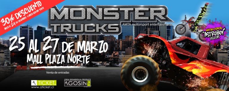 Pronto se acerca la Navidad y que mejor regalo que comprar unos de los tickets de descuento que Monster Trucks ofrece hasta el 24 de diciembre en www.aticket.cl, para los fanáticos de estas camionetas que destruyen todo a su paso. Los asistentes también podrán disfrutar de las increíbles acrobacias de freestyle con destacadas figuras, entre ellos el chileno «Astroboy» Villegas, campeón mundial de esta disciplina y que regresa a nuestro país.
