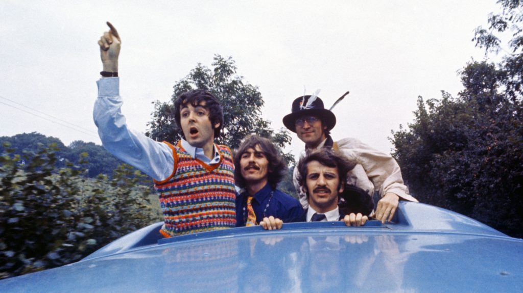 The Beatles look out of the Magical Mystery Tour coach skylight, on location in England in September 1967.