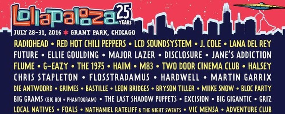 Noticias Lollapalooza Chicago reveló su cartel con Radiohead y Red Hot Chili Peppers a la cabeza Por Equipo Futuro | 23 Mar, 2016. 10:29 hrs El festival se desarrollará entre el 28 y 31 de julio en el Grant Park de Chicago. El festival Lollapalooza, que se acerca a cumplir 25 años de existencia en Estados Unidos, presentó el cartel de su edición 2016, el que tiene a Radiohead, Red Hot Chili Peppers y LCD Soundsystem a la cabeza. A realizarse entre el 28 y 31 de julio, también contará con la participación de grupos como Jane’s Addiction, The Last Shadow Puppets, Ghost, Kurt Vile & The Violators y Silversun Pickups. Los precios van desde US$120 para los pases diarios hasta US$4.200 por el paquete Platinum con entrada para los cuatro días. The #Lolla25 Lineup is here! View the Lineup by Day and get your 1-Day Tickets at 10am CT. https://t.co/80c4NV5uLB pic.twitter.com/zqkyqUj30U — Lollapalooza (@lollapalooza) 23 de marzo de 2016 Judas Priest planea volver al estudio en abril para comenzar a escribir su próximo disco Sangre De Toro abrirá show de Barón Rojo en el Teatro Cariola Sigue a FUTURO.cl en Google Discover Recibe nuestros contenidos directamente en tu feed. Seguir en Google Contenido patrocinado