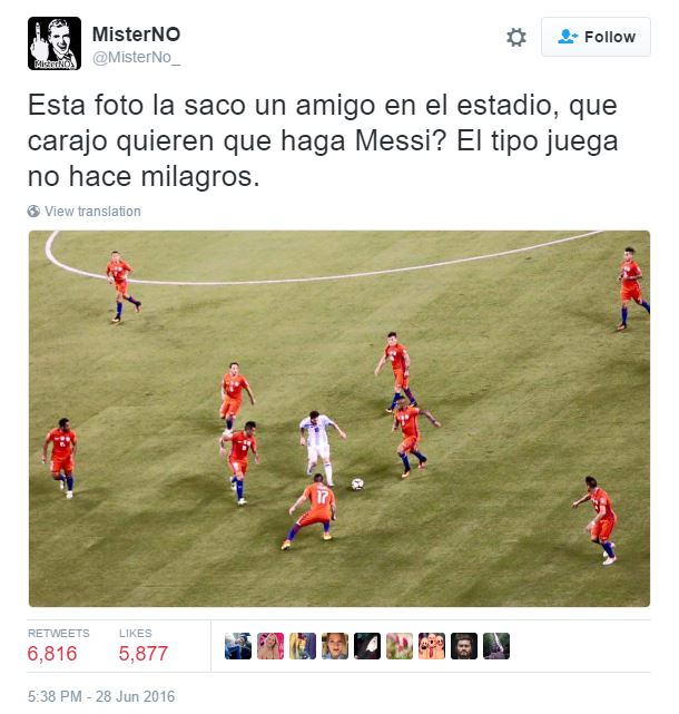 Fuera del triunfo de Chile, el gran golpe para muchos fue la renuncia de Messi a la selección de su país. A las 00:26 del 27 de junio, la cuenta del equipo trasandino. El tweet tuvo un impacto de 11.352 RT y 8.821 likes.