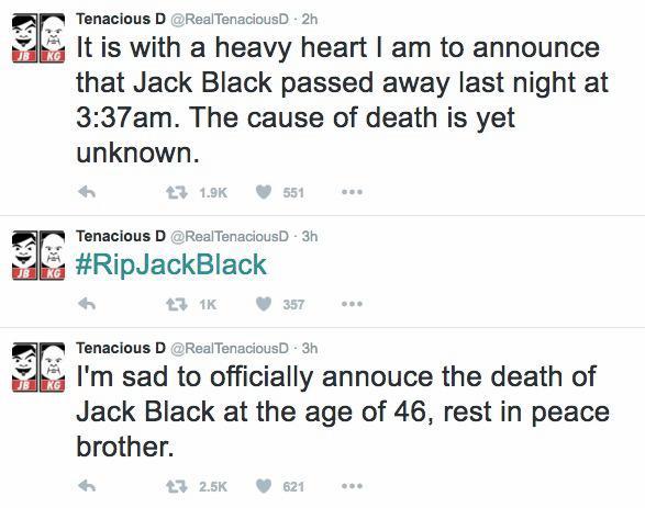 ACTITUD FUTURO Jack Black murió y resucitó el mismo día en Twitter Por Equipo Futuro | 06 Jun, 2016. 01:52 hrs La cuenta de Tenacious D en la red social fue hackeada el fin de semana. Tenacious D, la banda de Jack Black, anunció su muerte por error la mañana del pasado domingo, y en Twitter se hizo eco de la noticia al instante. La información sobre la muerte del músico y actor estadounidense de 46 años surgió desde la cuenta oficial de su grupo. Afortunadamente para los fans del actor era todo mentira. Poco después la propia cuenta del grupo desmintió rotundamente la muerte de Jack Black y afirmó que «habían pirateado su cuenta y que está vivo y bien». WE had our Twitter account hacked. We can assure you that Jack is ALIVE and WELL and that this was a sick «prank». — Tenacious D (@RealTenaciousD) 5 de junio de 2016 Fox pidió disculpas tras críticas por uno de los afiches de "X-Men: Apocalypse" Actriz de "Game Of Thrones" asegura que la serie la sacó de la prostitución y del porno Sigue a FUTURO.cl en Google Discover Recibe nuestros contenidos directamente en tu feed. Seguir en Google Contenido patrocinado