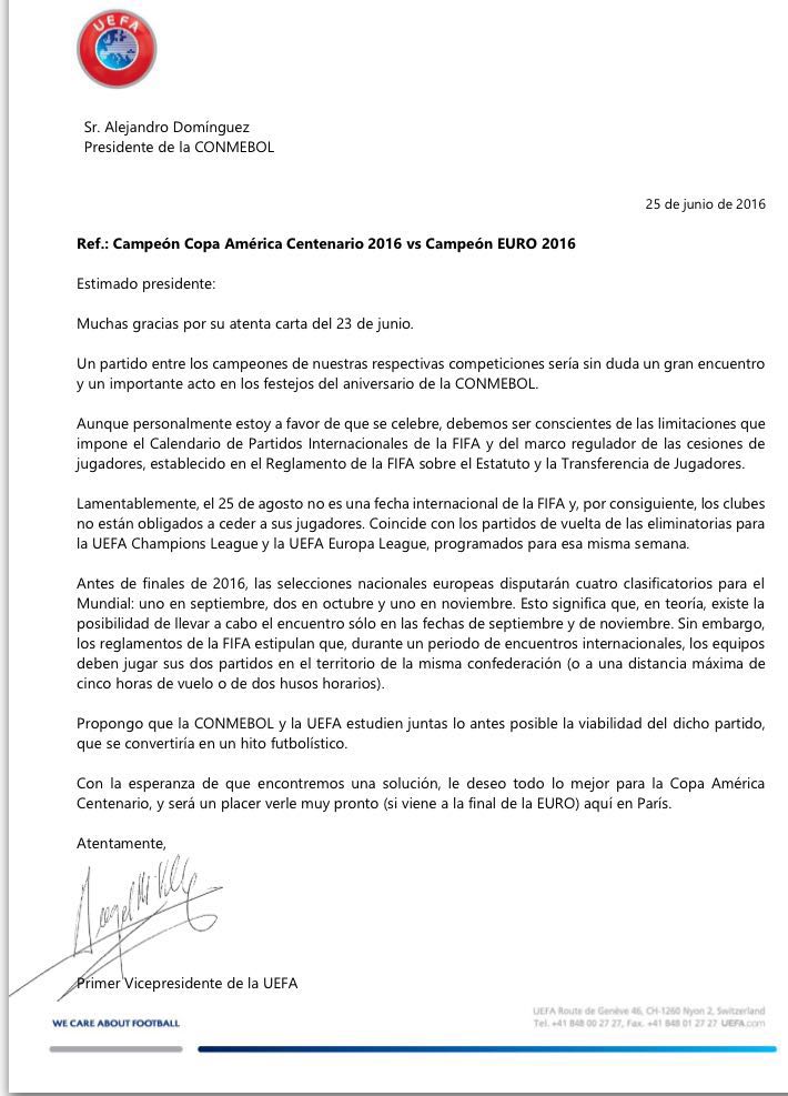 La misiva fue enviada el 25 de junio por el vicepresidente de la UEFA, Ángel María Villar, respecto del partido entre el campeón de la Copa América Centenario 2016 y el campeón de la EURO 2016. El español ve con buenos ojos la realización del «duelo de campeones».
