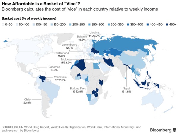 De acuerdo a un estudio realizado por la revista Bloomberg a un total de 103 países, Chile es el quinto país del mundo donde es más asequible drogarse, ya que solo se ocupa un 22,8% del salario semanal para adquirirlo.
