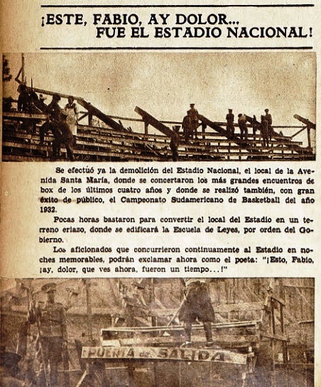 La demolición fue sorpresiva: de un día para otro el boxeo se quedó sin casa y pasarían años antes de que volvieran a organizarse veladas pugilísticas como la gente en el Teatro Caupolicán (recién en etapa de proyecto). Y también sufrieron los cesteros: “Desaparecido el Estadio Nacional, cuya utilidad e importancia dentro de nuestro ambiente basketballístico fué discutida en algunos círculos, sólo contamos con las canchas del Tabú, Unión Española, Santa Laura, el gimnasio Nacional en la calle Concepción y otras de menor importancia, todas las cuales desde el punto de vista del público carecen de la capacidad mínima para un gran encuentro”, lamentaba As.