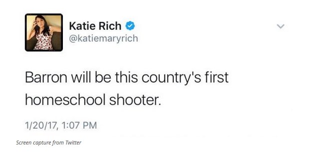 Katie Rich fue sancionada indefinidamente tras escribir en su cuenta de Twitter: «Barron será el primero de este país en ser un francotirador de una escuela en casa».