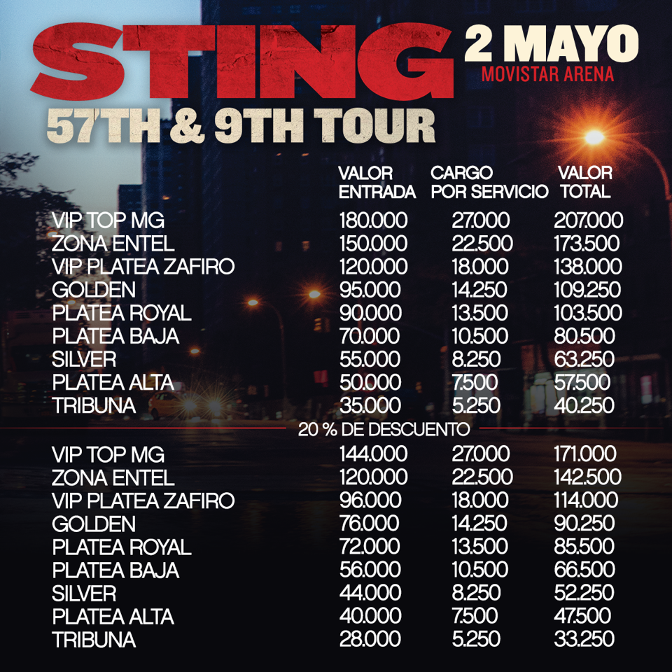 Las entradas estarán disponibles desde el martes 31 de enero para los miembros del fan club de Sting. El jueves 2 de febrero, comenzará la preventa para clientes Entel bajo sistema Puntoticket, quienes tendrán un 20% de descuento. Revisa valores y localidades…