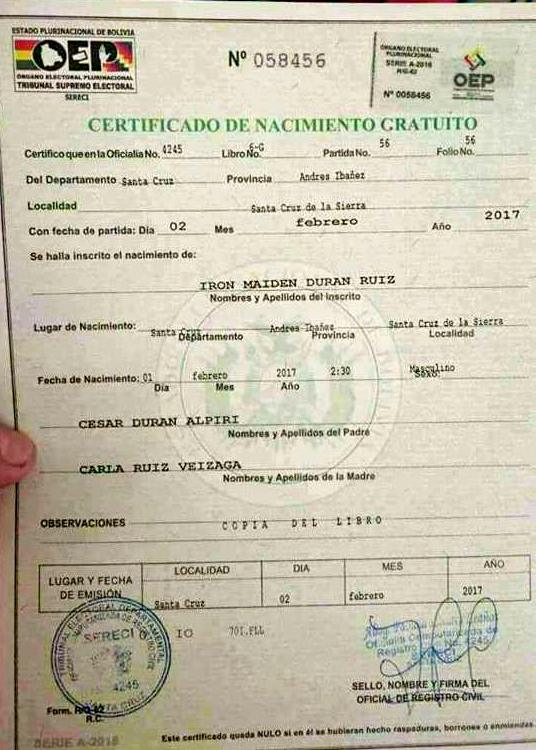 El jueves 2 de febrero nació en esa localidad el hijo de César Durán y Carla Ruiz, que decidieron que su recién nacido debía llamarse Iron Maiden, tal como figura en el parte de nacimiento, compartido en redes sociales por estos días. La decisión de la pareja cruzó las fronteras del país altiplánico, siendo comentado en varios lugares.
