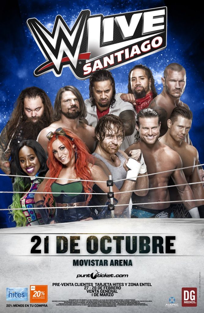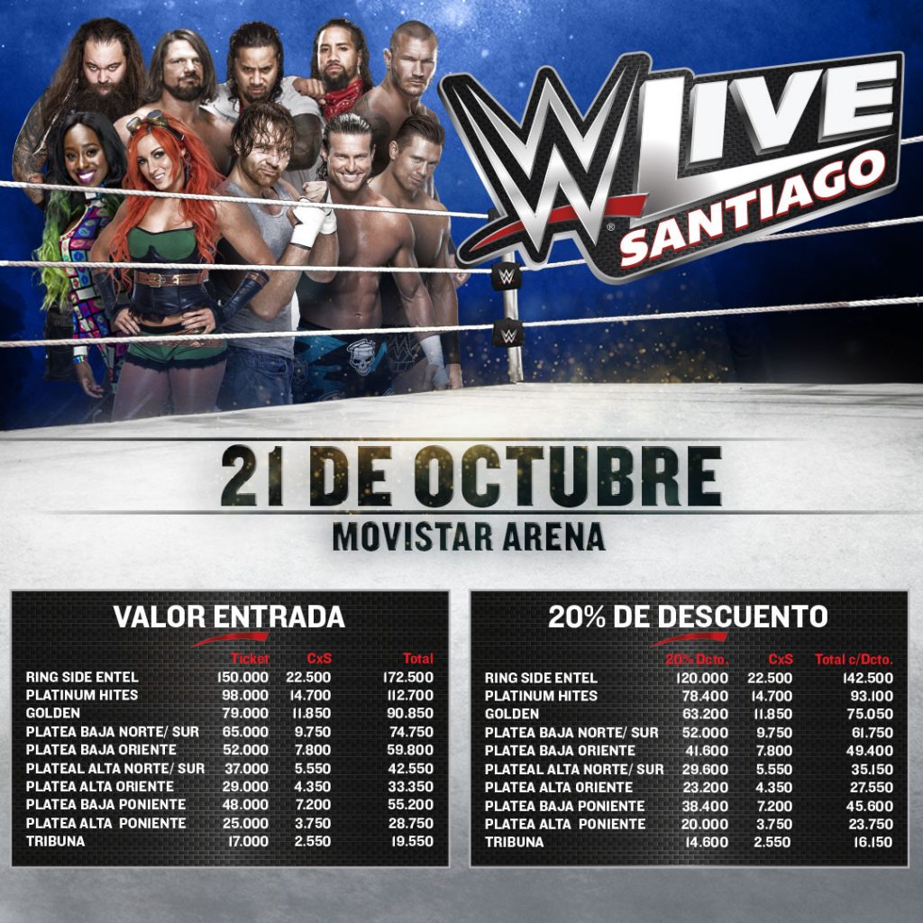 ACTITUD FUTURO Regreso de la WWE a Chile tiene fecha confirmada Por Equipo Futuro | 20 Feb, 2017. 00:02 hrs Sábado 21 de octubre, Movistar Arena. Entradas en Puntoticket. El regreso de la WWE a Santiago ya tiene fecha confirmada. WWE Live se presentará nuevamente en nuestro país el sábado 21 de octubre, en el Movistar Arena. La preventa para los clientes de Hites y la Zona Entel será los días lunes 27 y martes 28 de febrero, y la venta general comenzará el miércoles 1 de marzo. Todo mediante el sistema Puntoticket. Revisa precios a continuación… Andrónico Luksic acepta invitación de twittero a tomar once a su casa CONCURSO // Futuro te invita al Beerfest Cerrillos 2017 Sigue a FUTURO.cl en Google Discover Recibe nuestros contenidos directamente en tu feed. Seguir en Google Contenido patrocinado