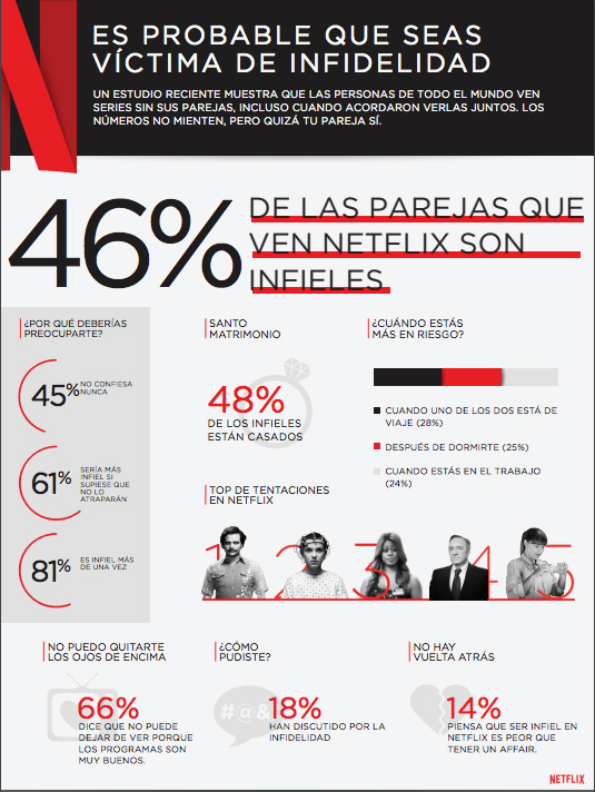 El estudio comenzó en 2013 y desde la compañía de streaming aseguran que esta tendencia se ha triplicado con Latinoamérica en la delantera. México, Brasil y Colombia están en los tres primeros lugares, mientras que Chile ocupa el cuarto puesto dividido por igual entre hombres y mujeres. Un engaño serial oculto, ya que los encuestados nunca confiesan el hecho y también reconocen que lo volverían a hacer si no los descubren.