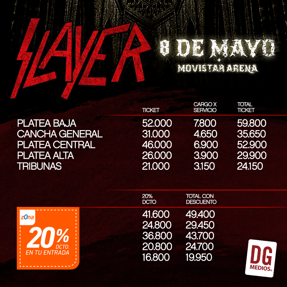Noticias Slayer regresa a Chile – lunes 8 de mayo, Movistar Arena Por Equipo Futuro | 02 Feb, 2017. 00:00 hrs Entradas disponibles en Puntoticket desde el lunes 6 de febrero. Revisa precios acá. Slayer, una de las cuatro grandes de la historia del thrash metal, confirma su regreso a Chile. La banda de Tom Araya y Kerry King estará de regreso en nuestro país mostrando su más reciente disco de estudio, «Repentless», el lunes 8 de mayo en el Movistar Arena. Las entradas estarán disponibles desde las 11 de la mañana del lunes 6 de febrero en Puntoticket. Revisa precios a continuación… Canal 13 deberá pagar multa de más de 4 mil millones de pesos por reportaje de "Contacto" Consuelo dorado Sigue a FUTURO.cl en Google Discover Recibe nuestros contenidos directamente en tu feed. Seguir en Google Contenido patrocinado