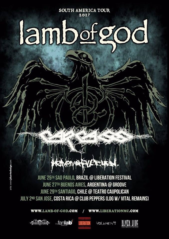Una adición potente para la cartelera de conciertos, un combo triple de metal internacional se dejará caer por estos lados: los ingleses Carcass, los estadounidenses Lamb of God y los alemanes Heaven Shall Burn confirmaron una gira juntos por Latinoamérica, que incluye una pasada por nuestro país el jueves 29 de junio en el Teatro Caupolicán, según comunicó Carcass a través de su Facebook oficial.