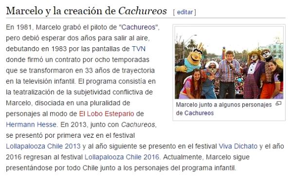 «Marcelo José Raúl Hernández Rosas, más conocido como Marcelo o el tío Marcelo (Santiago, 19 de marzo de 1948), es un cantante y conductor de televisión chileno, conocido por su programa infantil ‘Cachureos'». Hasta ahí va todo bien con la biografía en Wikipedia de uno de los rostros ícono de los programas infantiles por más de tres décadas en la televisión chilena.