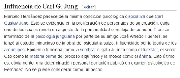 Además, en un apartado de la página, se señala que Marcelo Hernández «padece de la misma condición psicológica disociativa de Carl Gustav Jung. Esto se evidencia en la proliferación de personajes de su creación, cada uno de los cuales revela un aspecto de la personalidad compleja de su autor».