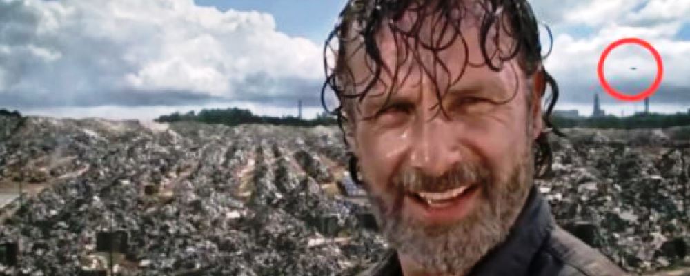 En el capítulo 9 de la séptima temporada, se puede observar que el personaje Rick Grimes mira hacia un vertedero, aunque se nota que está sobre el fondo verde del croma, pero lo que realmente los fans no dejaron pasar es que un supuesto avión cruza el cielo a gran velocidad.