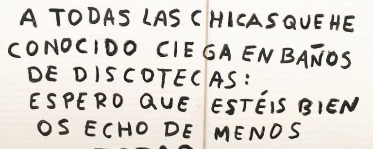 El pasado fin de semana, la artista española Anastasia Bengoechea estaba «algo perjudicada», según contó a Verne del diario El País, en un baño de Barcelona cuando la inspiración cayó. Según ella, tenía que ser un mensaje que reforzara «esa intimidad y conexión que se crea entre mujeres en un lugar así».