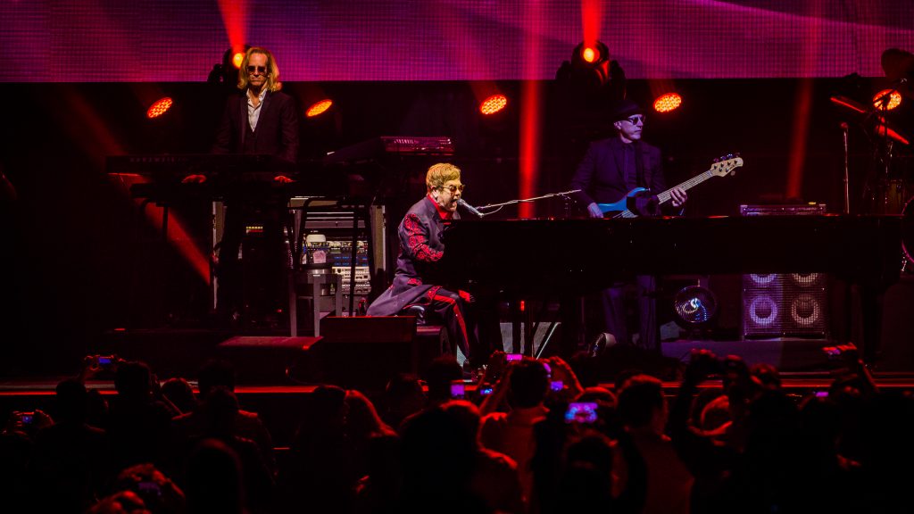Diez minutos antes de las 22 horas la banda de Elton John comenzó a sacudir el Arena. Elton John, enfundado en traje negro con vivos rojos aparecía sobre el escenario para dar rienda suelta una selección que no era fácil porque no existe una completa conexión entre el público y todo el extenso repertorio de Elton John (32 discos de estudio). Canciones como «Levon», «Philadelphia Freedom» o «Burn Down The Mission» pertenecen a su primera época, lejos aún sus grandes éxitos comerciales de mediados de los 80 o 90, pese a ello Sir Elton sabe cómo hacer el equilibrio porque cada una de sus canciones pesan lo que deben y alcanzan el estatus de inmortales dentro del mejor repertorio del rock del siglo XX.