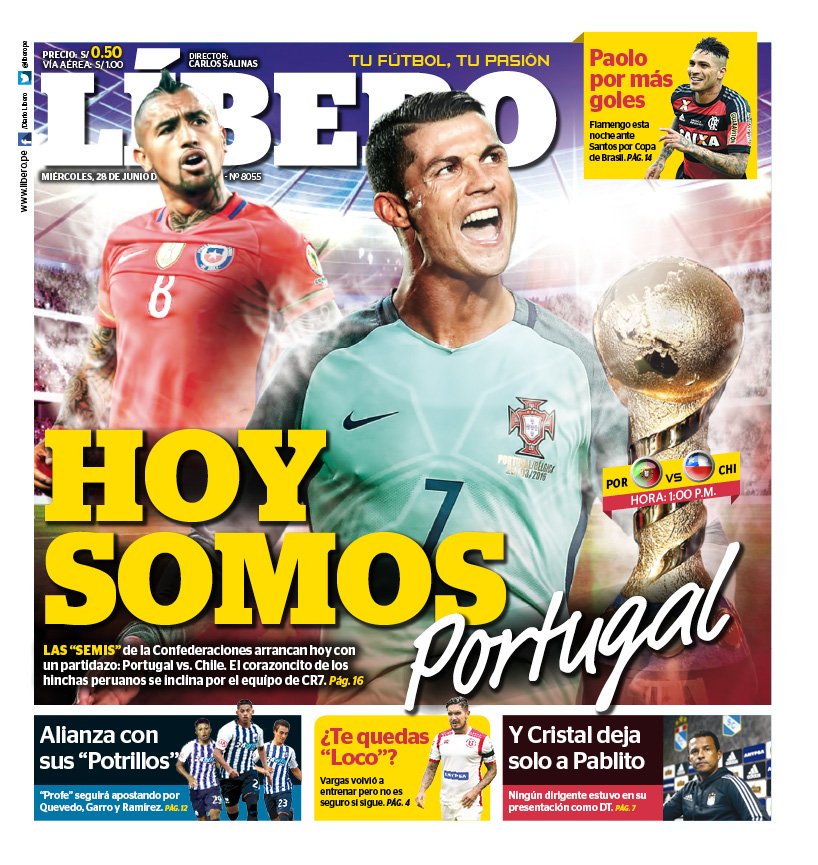 ACTITUD FUTURO Diario peruano desata polémica por portada antichilena: «Hoy somos Portugal» Por Equipo Futuro | 28 Jun, 2017. 00:10 hrs Según asegura Líbero, «el corazoncito de los hinchas peruanos se inclina por el equipo de CR7». Esta mañana ha generado polémica la portada del diario peruano Líbero de cara a las semifinales de la Copa Confederaciones, donde Chile enfrentará a Portugal. El rotativo ilustró su primera plana con Arturo Vidal y Cristiano Ronaldo. Sin embargo, su titular lo dice todo: «Hoy somos Portugal». En su bajada, el periódico destaca que «el corazoncito de los hinchas peruanos se inclina por el equipo de CR7». Recordemos que La Roja enfrentará al campeón europeo en el Arena Kazán hoy a las 14 hrs de Chile. actualidad Chile Copa Confederaciones curiosidades Portugal "Me duele, se me salió otra vez": El día en que Alexis Sánchez se sobrepuso al dolor para vencer a Portugal Dead & Company - Unstaged 2015 Sigue a FUTURO.cl en Google Discover Recibe nuestros contenidos directamente en tu feed. Seguir en Google Contenido patrocinado