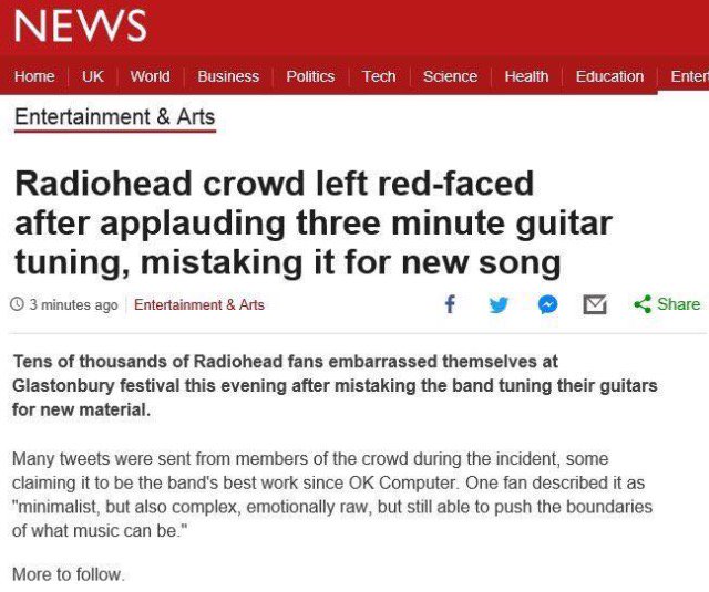 Según cuenta el rumor, el hecho ocurrió cuando fans contemplaron por tres minutos el momento en que la banda de Oxford afinaba sus guitarras. Los acérrimos seguidores habrían asegurado estar en presencia de una nueva canción y el rumor se esparció de inmediato en redes sociales garcías a un pantallazo de una supuesta nota de la BBC.