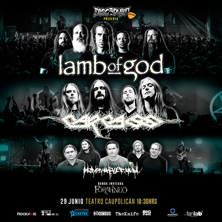 Las entradas para ver a Carcass junto a Lamb of God y Heaven Shall Burn el jueves 29 de junio en Santiago, están a la venta por sistema Ticketek y puntos habilitados en Falabella. Ya están agotadas las localidades de Cancha y Palco, quedan de Platea a $29.000 más cargo por servicio. Sin recargo en tienda The Knife del Eurocentro y tienda Rock Music del Portal Lyon.