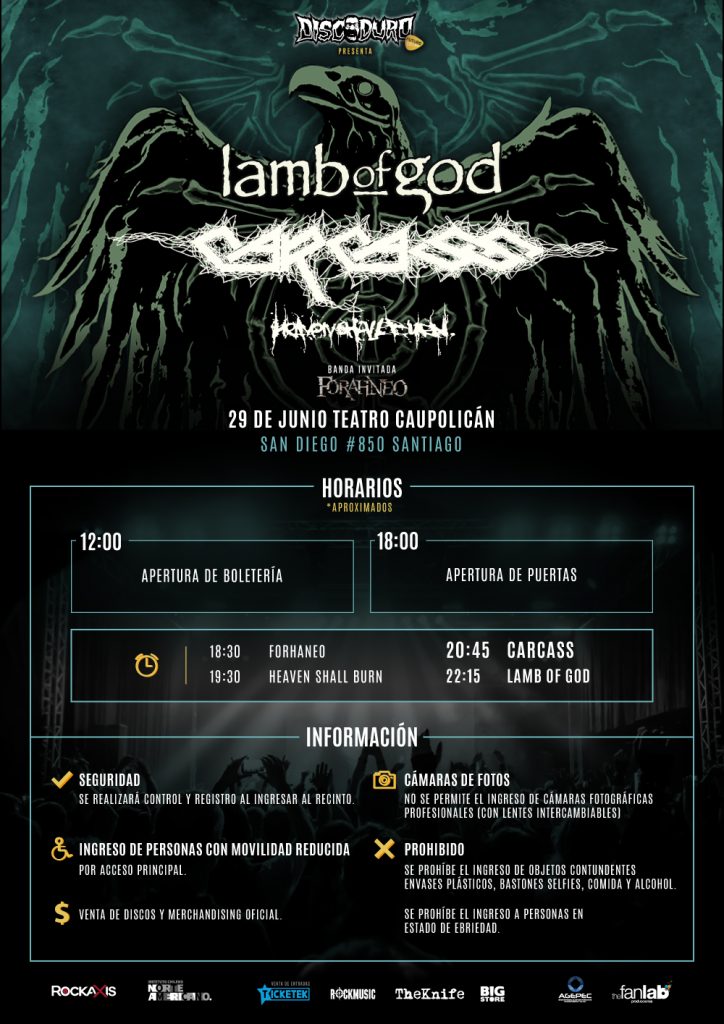 Noticias Lamb Of God, Carcass y Heaven Shall Burn en Chile – horarios y recomendaciones Por Equipo Futuro | 29 Jun, 2017. 13:07 hrs Las puertas del Teatro Caupolicán se abren a las 6 de la tarde. Esta noche veremos a Lamb Of God, Carcass y Heaven Shall Burn juntos en el Teatro Caupolicán. Antes de que vayas al recinto ubicado en San Diego 850, compartimos los horarios y recomendaciones para la jornada, que tendrá sus puertas abiertas desde las 6 de la tarde y venta de klas últimas entradas en la boletería del teatro… Carcass Conciertos en Chile curiosidades Heaven Shall Burn Lamb Of God Formación original de Smashing Pumpkins tendría su reunión en 2018 CONCURSO // Futuro te invita a la avant premiere de "El Planeta de los Simios: la Guerra" Sigue a FUTURO.cl en Google Discover Recibe nuestros contenidos directamente en tu feed. Seguir en Google Contenido patrocinado