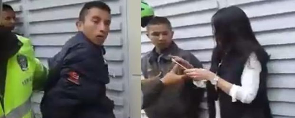 En la capital de Colombia, dos sujetos utilizaban la chaqueta del uniforme del Sistema Integrado de Transporte para pasar desapercibidos y realizar sus robos. Una joven se encontraba en la zona y fue víctima de ellos, pero alcanzó a avisar a la policía, que capturó a los hombres, buscaron en sus bolsillos y encontraron el celular. La joven y otro hombre los acusan de realizar el robo.