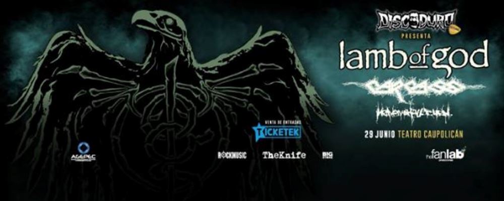 Noticias Se agota Cancha y palcos para Lamb Of God, Carcass y Heaven Shall Burn en Chile Por Equipo Futuro | 19 Jun, 2017. 16:40 hrs Jueves 29 de junio, Teatro Caupolicán. Entradas en Ticketek. Un éxito ha resultado el triple cartel que junta a Lamb Of God, Carcass y Heaven Shall Burn para una noche memorable de metal el jueves 29 de junio, en el teatro Caupolicán. A la fecha, ya agotaron las entradas de cancha y palcos, con lo que podría anticiparse que será a teatro lleno. De esta forma, sólo quedaría Platea a 29 mil pesos y la encuentras a través del sistema Ticketek. Carcass Conciertos en Chile Heaven Shall Burn Lamb Of God música Iggy Pop - Instinct CONCURSO // Futuro te invita a la celebración de los 25 años de Los Miserables Sigue a FUTURO.cl en Google Discover Recibe nuestros contenidos directamente en tu feed. Seguir en Google Contenido patrocinado