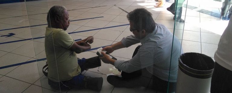 En la foto se puede ver a un trabajador de una sucursal sentándose en el suelo para atender a un cliente con capacidades diferentes. Lo que más llamó la atención de las personas es que se trataba del gerente del Banco Rio de Janeiro, Luis Claudio de Souza Lima.