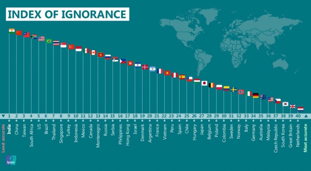 De todas las naciones investigadas, India quedó en el primer lugar de los países más ignorantes.