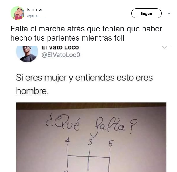 «Si eres mujer y entiendes esto eres hombre»; escribió el sujeto, junto a una fotografía en la que aparece un dibujo simulando los cambios de los automóviles, aunque con la ausencia de uno. Además, da la pista que lo ausente no es exactamente el número seis.