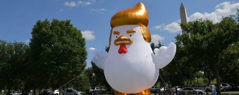 El pasado miércoles apareció un globo gigante con la forma de una gallina, con el cabello del presidente de Estados Unidos, Donald Trump, que se volvió rápidamente viral.