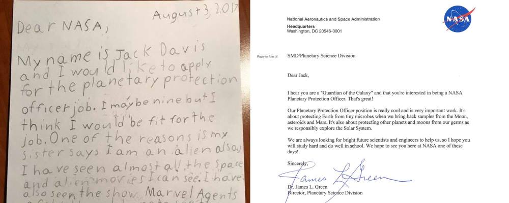 Nos enteramos que eres un “Guardián de la Galaxia” y que estás interesado en ser un Oficial de Protección Planetaria de la Nasa. ¡Eso es genial! El puesto es increíble y muy importante. Es sobre proteger la Tierra de pequeños microbios cuando traemos muestras de la Luna, asteroides y Marte. También es sobre proteger otros planetas y lunas de nuestros gérmenes, mientras exploramos responsablemente el Sistema Solar. Siempre estamos buscando a brillantes futuros científicos e ingenieros que nos ayuden, así que esperamos que estudies duro y te vaya bien en la escuela. ¡Esperamos verte aquí en la Nasa uno de estos días!