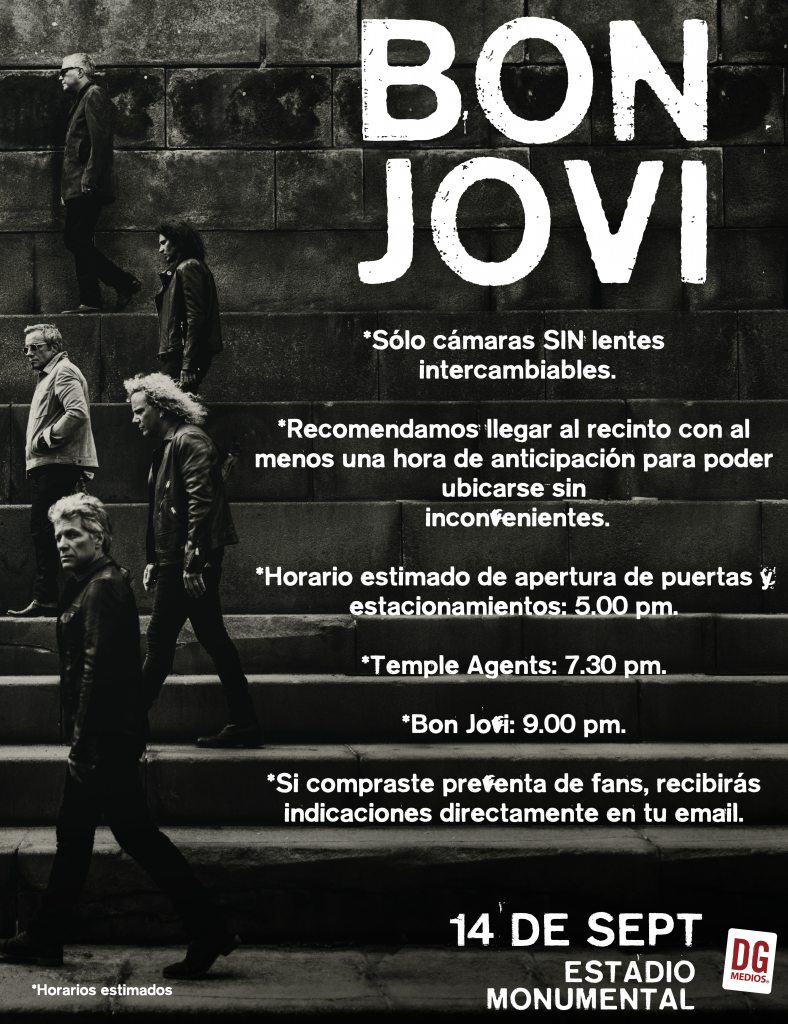 Noticias Bon Jovi en Chile – horarios y recomendaciones Por Hector Muñoz Tapia | 13 Sep, 2017. 10:12 hrs Este jueves 14 de septiembre, Bon Jovi tocará por quinta vez en Chile, nuevamente en el Estadio Monumental. Y en la previa, la producción a cargo reveló los horarios y las recomendaciones de seguridad para la jornada. Las puertas se abrirán a las 5 de la tarde, el show de Temple Agents está programado a las 19:30 hrs y Bon Jovi saldrá al escenario a las 21 hrs. Además se recomienda llegar con una hora de anticipación para poder ubicarse sin inconvenientes. Gene Simmons lanzará los demos que Kiss grabó junto a Van Halen Gene Simmons visitará la casa de los fans estadounidenses que compren su box set de 50 mil dólares Sigue a FUTURO.cl en Google Discover Recibe nuestros contenidos directamente en tu feed. Seguir en Google Contenido patrocinado