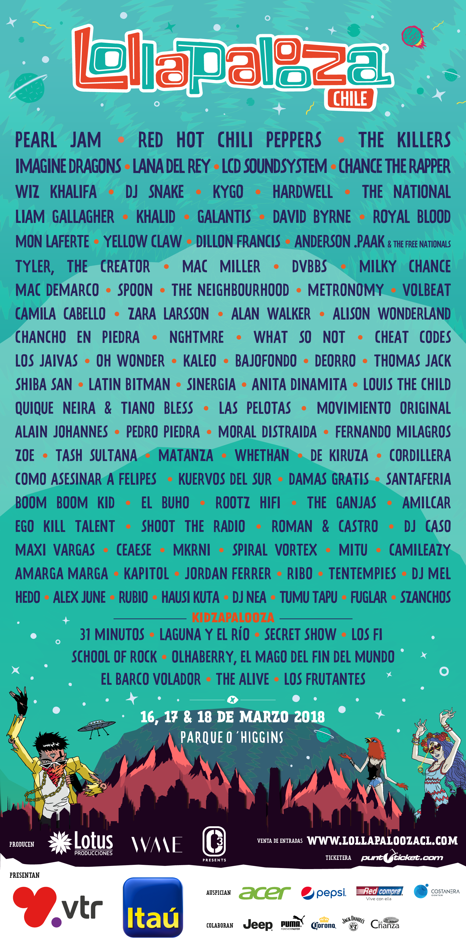 Esta mañana se reveló el cartel de Lollapalooza Chile 2018, que se realizará los días viernes 16, sábado 17 y domingo 18 de marzo en el Parque O’Higgins.