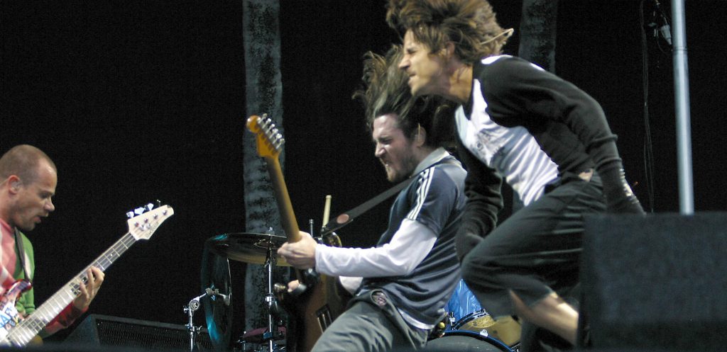 IRELAND - JUNE 25: Photo of John FRUSCIANTE and RED HOT CHILI PEPPERS and FLEA and Anthony KIEDIS; L-R: Flea, John Frusciante, Anthony Kiedis performing live onstage (Photo by James Cumpsty/Redferns)
