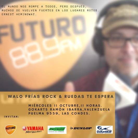 En este evento organizado por el mismo Walo Frías, podremos acompañar al conductor de Rock & Ruedas en su regreso al mundo físico de las tuercas, ya que volverá a subirse a una moto, la que conducirá por el kartodromo designado.