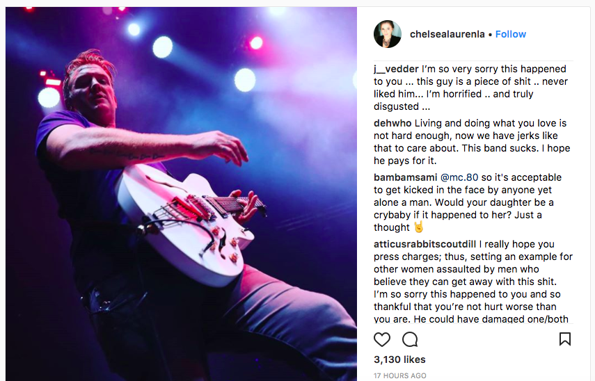 Noticias Esposa de Eddie Vedder en picada contra Josh Homme: «Es un pedazo de mierda, nunca me agradó» Por Hector Muñoz Tapia | 11 Dic, 2017. 14:25 hrs Diversas reacciones ha provocado el registro donde se ve a Josh Homme pateando la cámara de la fotógrafa Chelsea Lauren, quien se encontraba haciendo su trabajo al borde del escenario en un show de Queens Of the Stone Age en Los Angeles. Una de las más recientes es la que hizo Jill Vedder, esposa de Eddie Vedder de Pearl Jam, quien le mandó un mensaje a la afectada fotógrafa en donde expresa solidaridad con ella y aprovecha de disparar contra el cuestionado músico. Después de que Lauren publicara fotos que parecen probar que Homme la agredió intencionadamente y revelara que nadie de la banda se ha puesto en contacto con ella, Jill Vedder le comentó: «Estoy tan apenada de que te haya pasado esto… Este tipo es un pedazo de mierda… Nunca me agradó realmente… Estoy horrorizada… Y verdaderamente asqueada». Escucha "Antifa", primer destacado de "AmeriKKKant", nuevo disco de Ministry Roger Waters habló de su próximo show en Santiago y recordó su encuentro con Sebastián Piñera Sigue a FUTURO.cl en Google Discover Recibe nuestros contenidos directamente en tu feed. Seguir en Google Contenido patrocinado